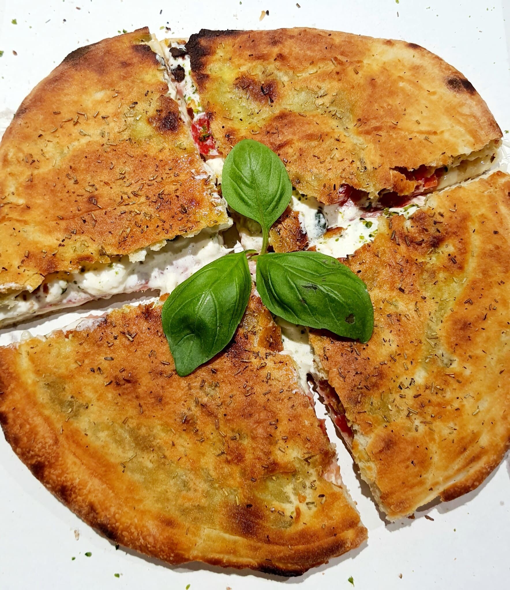 Une pâte à pizza cuite dans notre four, puis délicatement ouverte en son centre et garnie selon vos préférences. Elle est généralement accompagnée de mozzarella, de jambon de Parme et de notre magnifique burrata, à la fois crémeuse et fondante, pour sublimer vos papilles 🧀✨
