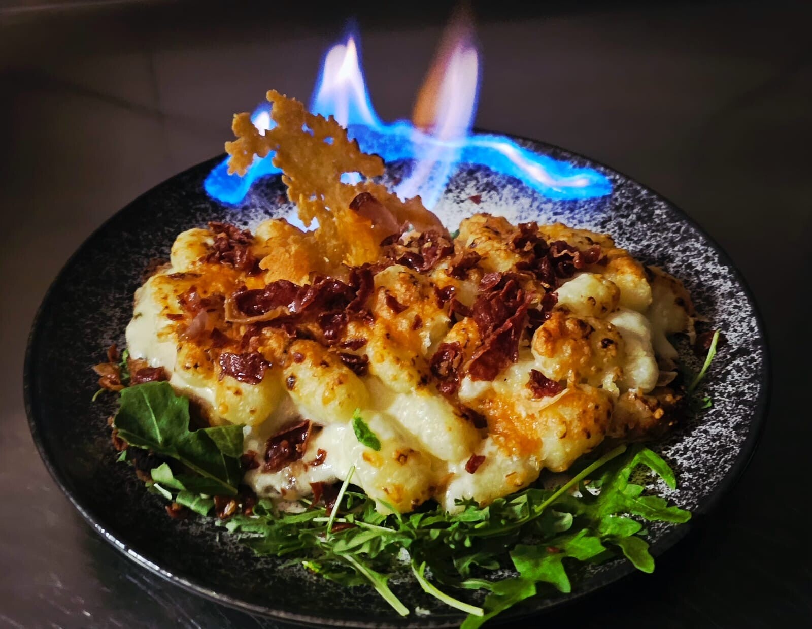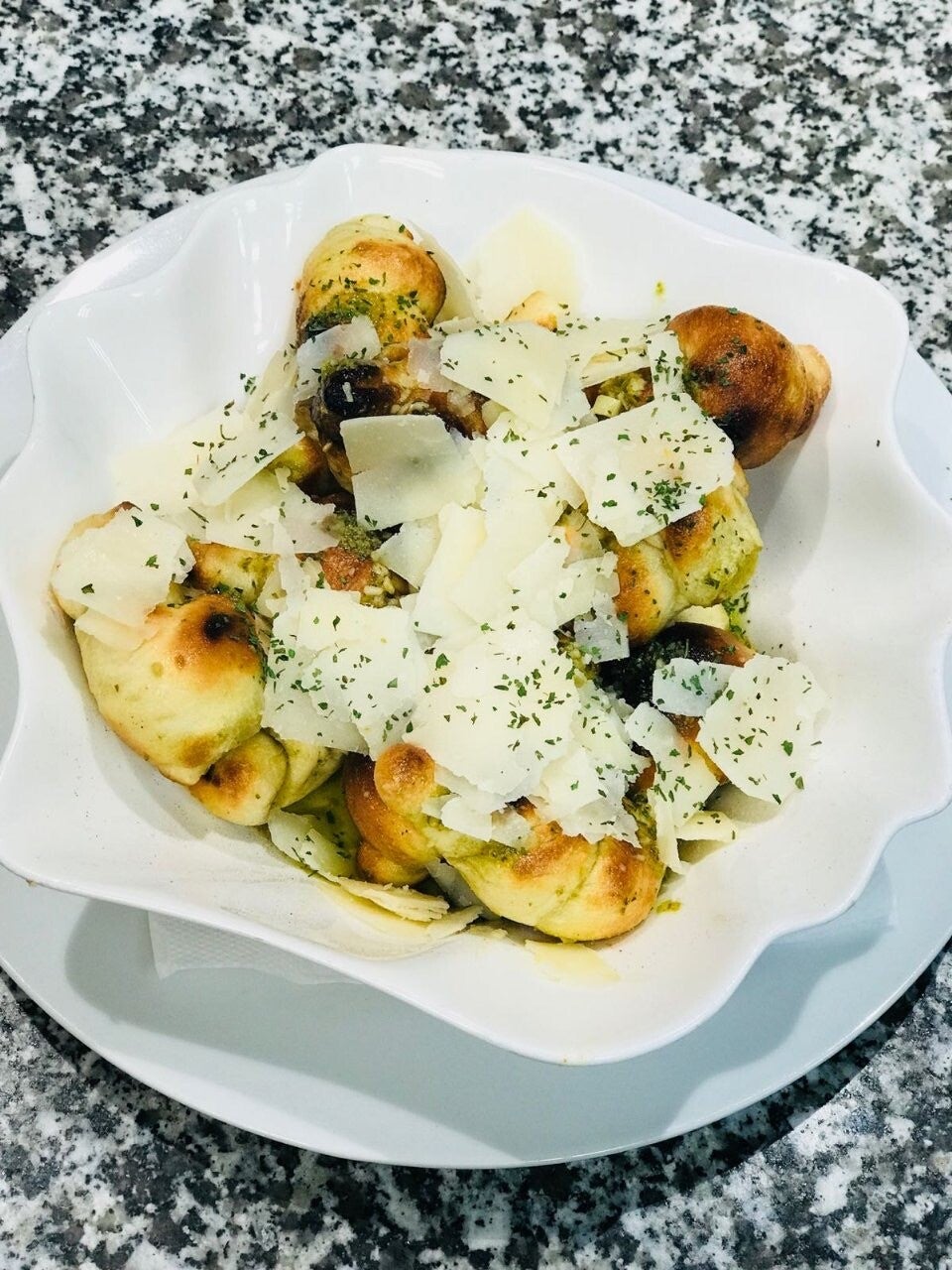 Une pâte à pizza fraîche, découpée et façonnée en nœud par notre chef, puis cuite dans notre four. Elle est ensuite délicatement enrobée d’un mélange d’huile d’olive, d’ail, de basilic et d’anchois. Une entrée idéale pour les grands amateurs de croquant et de saveurs intenses d’ail 🧄✨